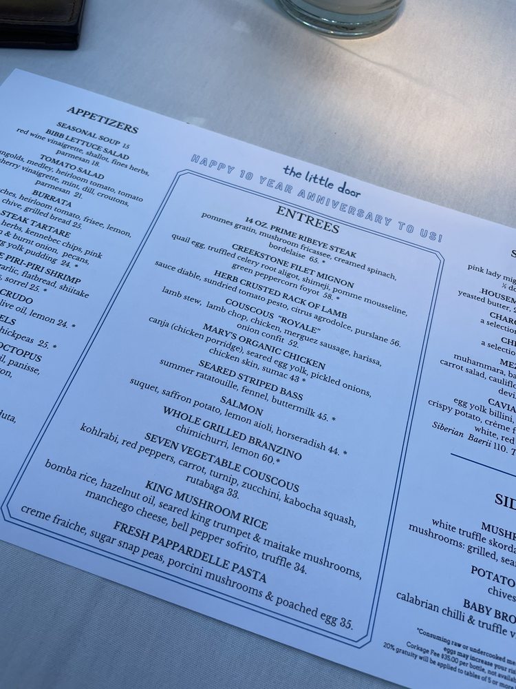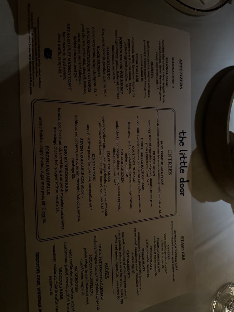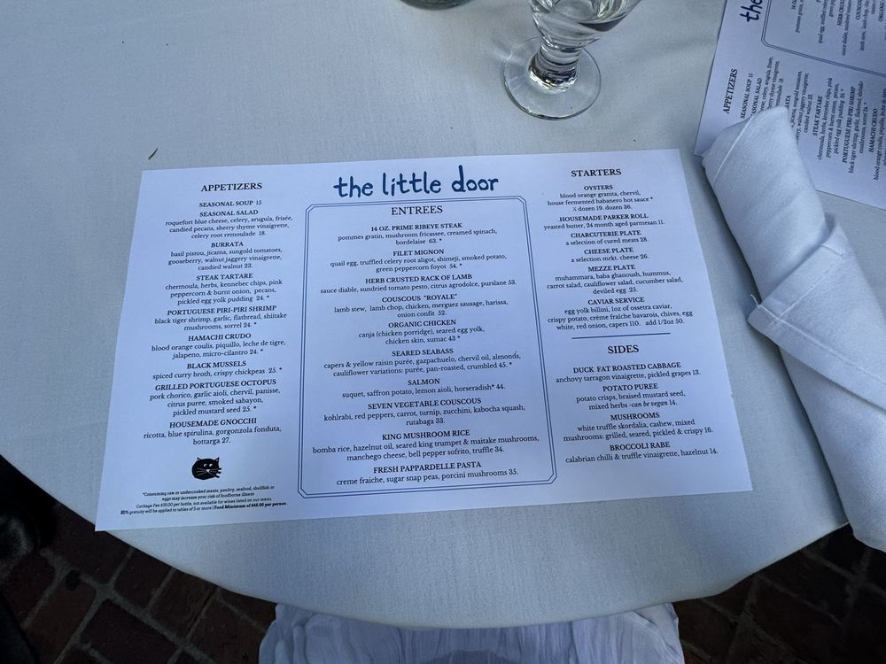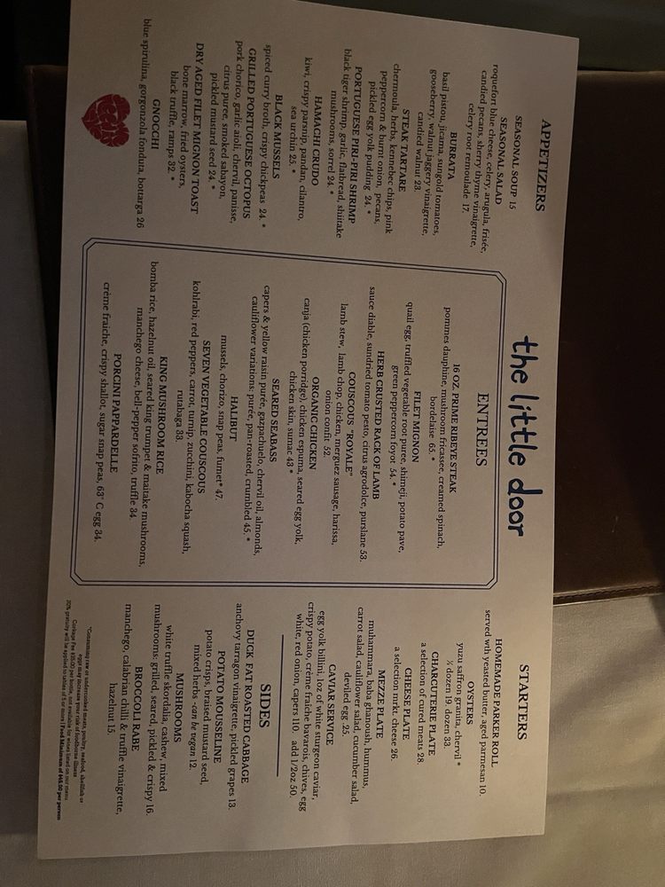Customer reviews praise the exquisite flavors of dishes like filet mignon, herb crusted lamb rack, and housemade parker roll. The attention to detail in presentation and service sets this restaurant apart. Despite the pricey water options, the overall dining experience at The Little Door leaves guests satisfied and coming back for more. Whether it's a special occasion or a casual dinner, this restaurant promises warm lighting, lush greenery, and top-notch service for a memorable dining experience.