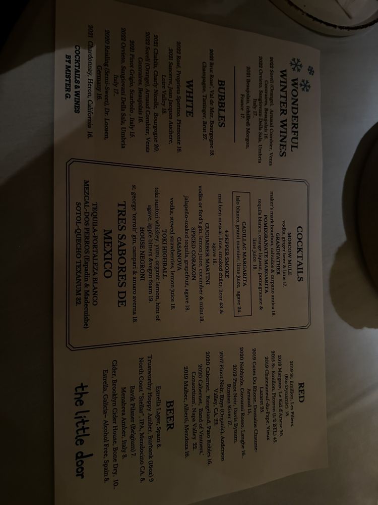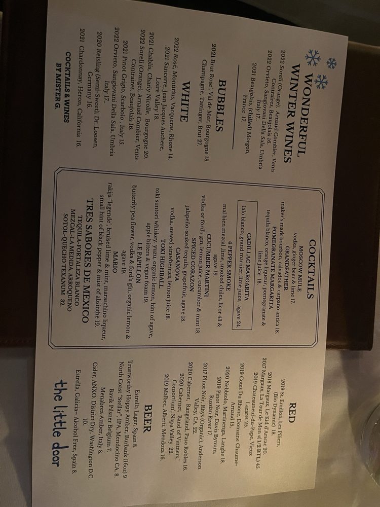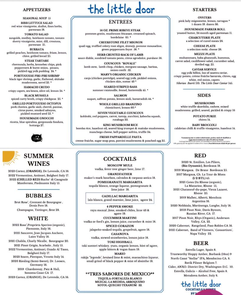Introducing The Little Door, a modern European-French-Mediterranean gem located in Los Angeles. This restaurant offers a romantic, cozy ambiance with outdoor seating and gender-neutral restrooms. Known for its diverse menu, including pescatarian, vegan, and vegetarian options, The Little Door provides a unique dining experience.